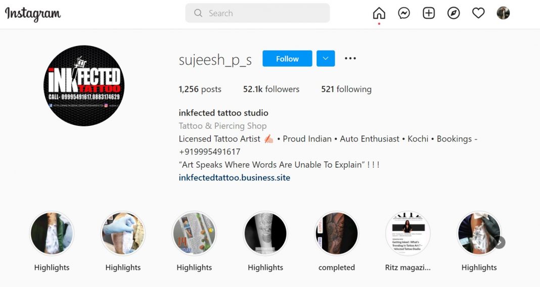 Sujeesh looks to be a popular tattoo artist in Kochi, Kerala, according to his Instagram account, which has over 52,000 followers.