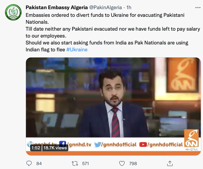 “Embassies ordered to divert funds to Ukraine for evacuating Pakistani Nationals. Should we also start asking funds from India as Pakistan Nationals are using Indian flags to flee from Ukraine”, the Pakistan Embassy in Algeria tweeted. It also said that till date no Pakistani national was evacuated and nor did it have funds to pay salaries to its officials or to help Pakistani nationals stranded in Ukraine.