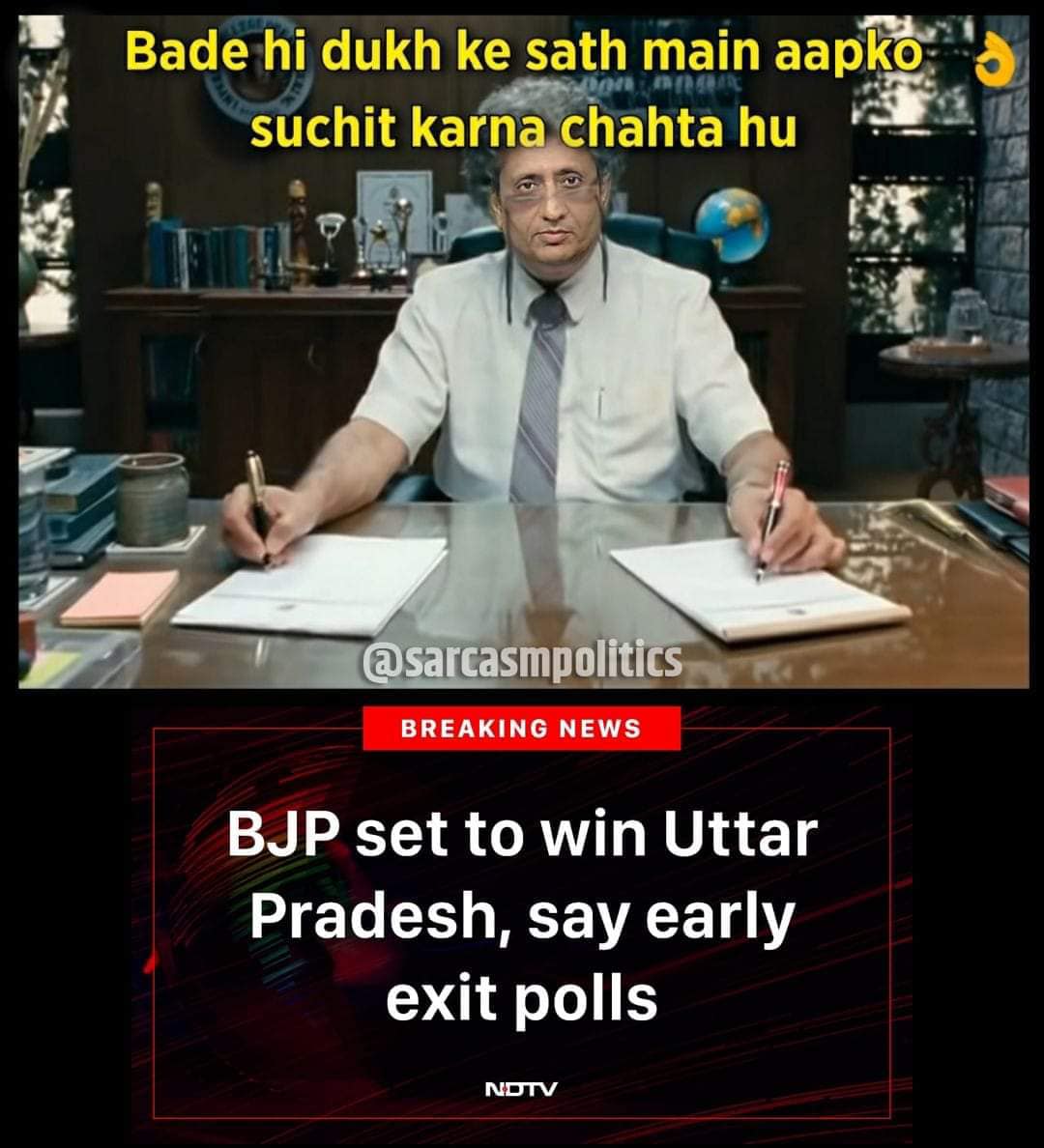 One such meme by a satire page named ‘Sarcasm Politics’ had portrayed Ravish Kumar and the caption in the meme read, “with great pain and grief I hereby convey you that BJP set to win Uttar Pradesh says early exit polls.”