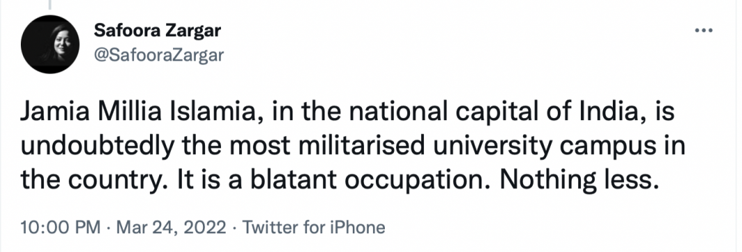 In the next tweet, Zargar shared, “Jamia Millia Islamia, in the national capital of India, is undoubtedly the most militarized university campus in the country. It is a blatant occupation. Nothing less.”