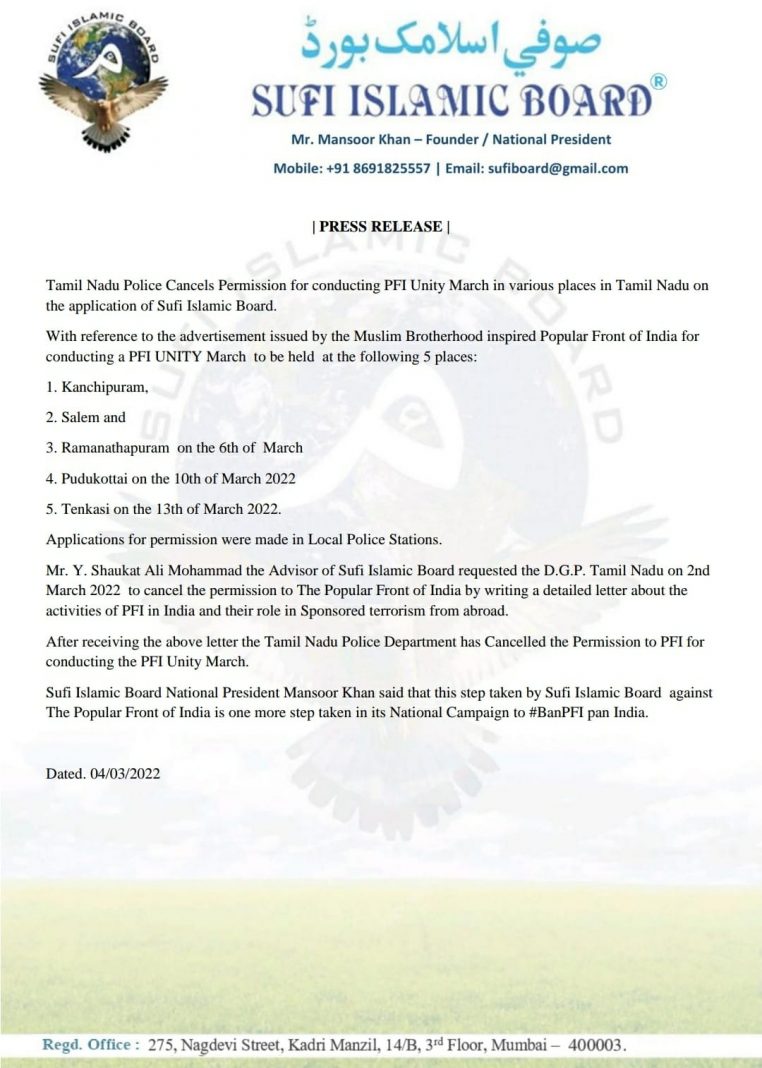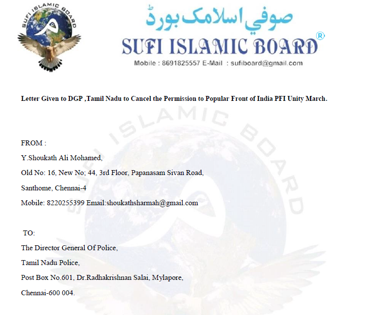 This action follows the Sufi Islamic Board’s comprehensive letter to the D.G.P. Tamil Nadu on March 2, 2022, requesting that the authorization granted to The Popular Front of India be revoked. Mr. Y. Shaukat All Mohammad, the Advisor of the Sufi Islamic Board, addressed the letter.