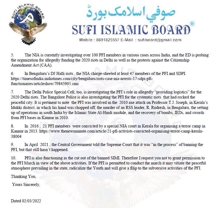 The Sufi Islamic Board stated in a notice that the permission for the march was cancelled after receiving the letter. Sufi Islamic Board National President Mansoor Khan stated that the Sufi Islamic Board’s action against the PFI is just another step in the organization’s National Campaign to Ban PFI across India.