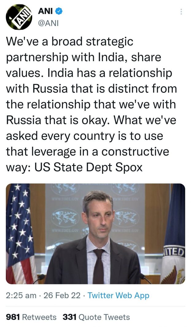 The Biden administration has made it clear that they understand that India has a broad strategic partnership with India and they are okay with it.