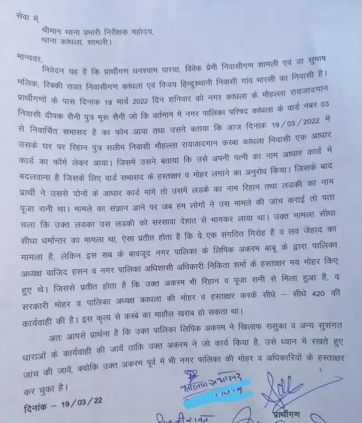 The complaint went on to say, “It appears to be a matter of conversion and love jihad. Municipal Clerk Akram Babu signed and sealed the document on behalf of Municipality President Wajid Hasan and Municipal Executive Officer Nikita Sharma. Akram appears to be hand in glove with Rikhan and Pooja Rani. This could have harmed the town’s atmosphere,” read the complaint.