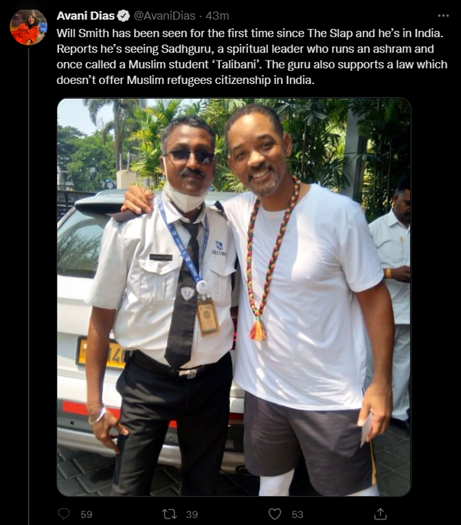 “Will Smith has been seen for the first time since The Slap and he’s in India. Reports he’s seeing Sadhguru, a spiritual leader who runs an ashram and once called a Muslim student ‘Talibani’ The guru also supports a law which doesn’t offer Muslim refugees citizenship in India,” she said in a tweet on Monday.