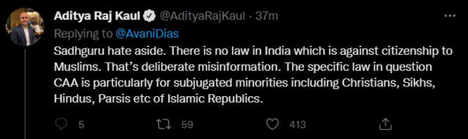 Also, Avani’s statement about Sadhguru supporting a discriminatory law is also baseless as the law itself is non-discriminatory and is actually inclusive supporting the persecuted minorities in the countries neighbouring India.