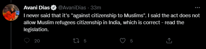 Thereafter, blatantly justifying her tweet, she said, “I never said that it’s “against citizenship to Muslims”. I said the act does not allow Muslim refugees citizenship in India, which is correct – read the legislation.”
