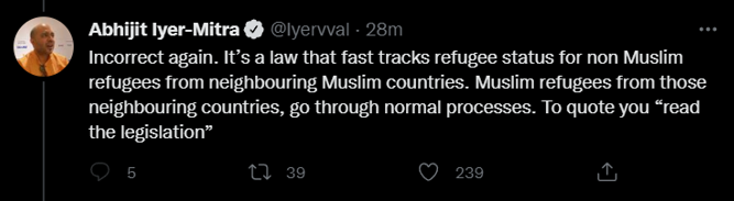 Abhijit Iyer-Mitra, a Twitter user, replied by saying that all of her arguments are bogus. He reinforced Aditya Raj Kaul’s position, saying that the law simply expedites citizenship for minorities in neighbouring Islamic nations and that other Muslims are allowed to apply for citizenship through normal channels.