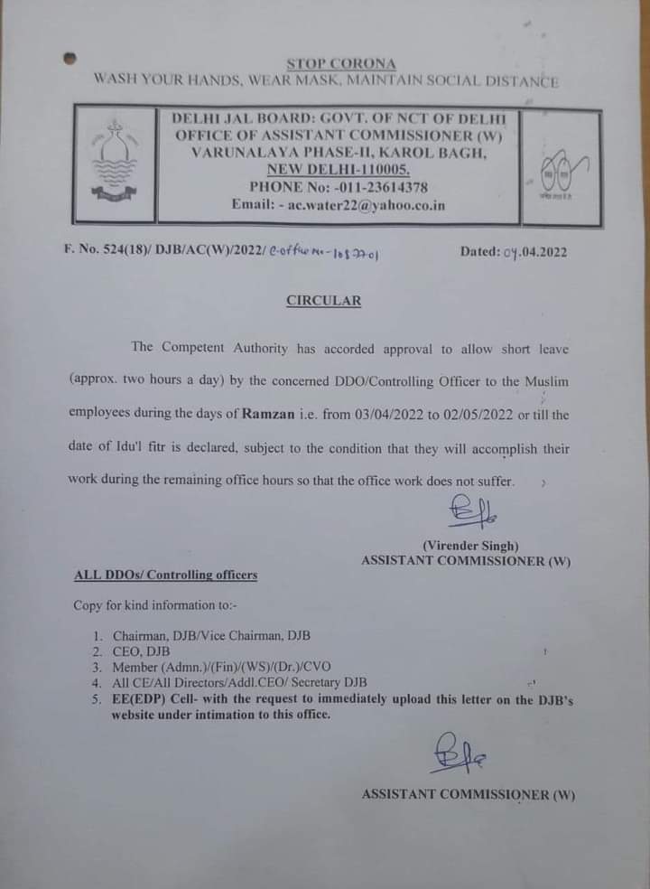 In a circular, the Assistant Commissioner of Delhi Jal Board Virender Singh stated, “The Competent Authority has accorded approval to allow short leave (approx. two hours a day) by the concerned DDO/Controlling Officer to the Muslim employees during the days /f R28 i.e. from 03/04/2022 to 02/05/2022.”