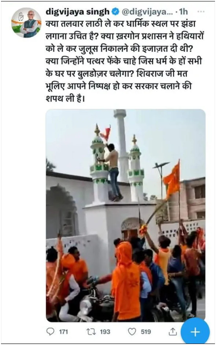 Chouhan was referring to a photograph of a man putting a saffron flag on the mosque, which Singh had posted on Twitter, saying that it was from Khargone. Chouhan refuted the claims made by Singh and said that the photograph shared by him was not from Madhya Pradesh. “Singh conspired to create religious unrest in the state. He attempted to push the state into communal riots. I will not forgive anyone who tried to cause communal riots in my state”, Chouhan had said. Singh later deleted the tweet as the state police registered multiple FIRs against him for posting the fake picture.