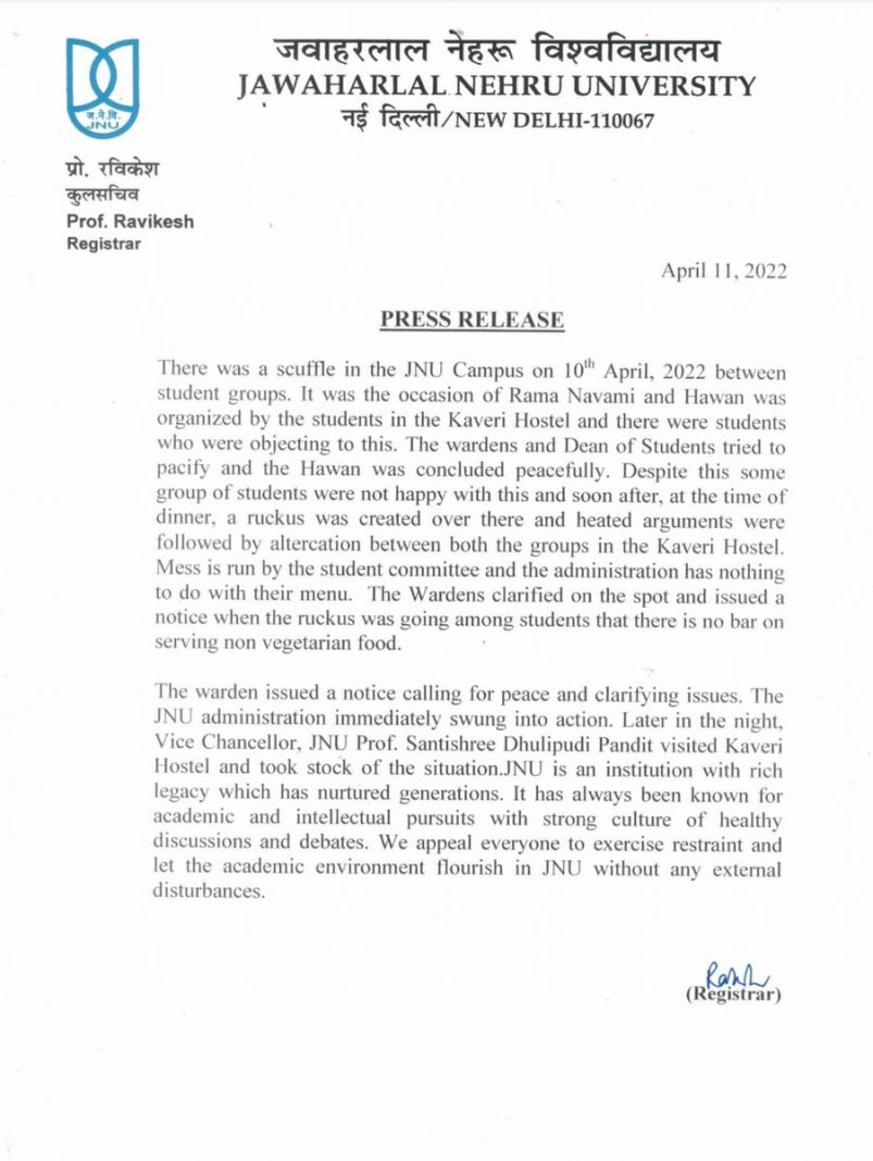 “There was a scuffle in the JNU Campus on 10 April 2022 between student groups. It was the occasion of Rama Navami and Hawan was organized by the students in the Kaveri Hostel and there were students who were objecting to this. The wardens and Dean of Students tried to pacify and the Hawan was concluded peacefully,” the statement noted.