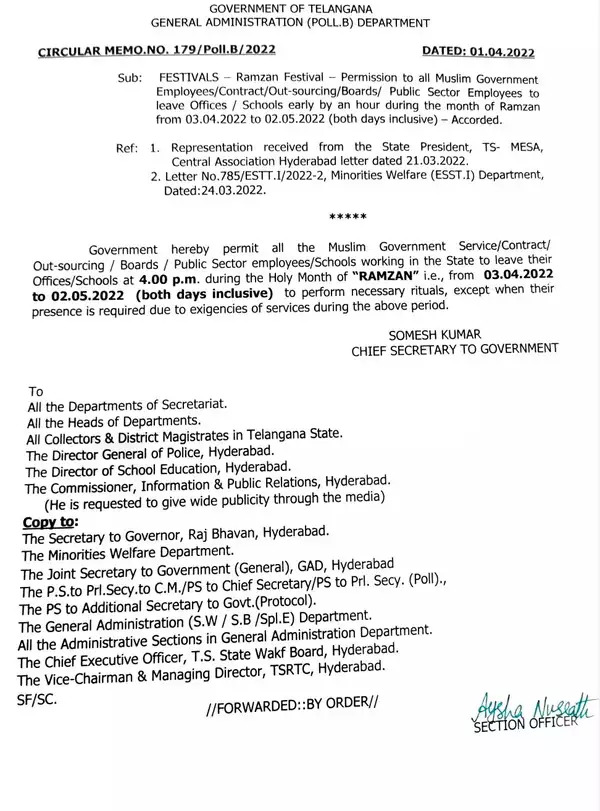 “Permission to all Muslim Government Employees/ Contract/ Out-sourcing/ Boards/ Public Sector Employees to leave Offices / Schools early by an hour during the month of Ramzan from 03.04.2022 to 02.05.2022 (both days inclusive) – Accorded,” the circular read.