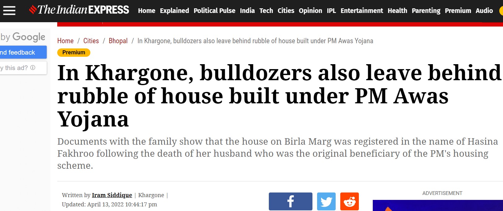 OpIndia had reported on April 13, how the claims being made by media houses like The Indian Express were completely misleading because the house of Haseena Fakhroo was not demolished because of the stone-pelting incident, it was bulldozed because it was built illegally using the PMAY grant.