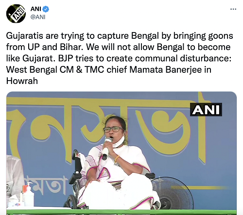 Ahead of the West Bengal elections, in a bid to attack Prime Minister Modi and Home Minister Amit Shah, both Gujaratis, Mamata Banerjee had alleged that ‘Gujaratis are trying to capture Bengal’ by bringing in goons from UP and Bihar. “Gujaratis are trying to capture Bengal by bringing goons from UP and Bihar. We will not allow Bengal to become like Gujarat. BJP tries to create a communal disturbance”, the West Bengal CM had said in one of her rallies at Howrah.