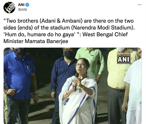 She had also slammed PM Modi-led government for the renaming of Sardar Patel Cricket Stadium at Motera in Ahmedabad to Narendra Modi Stadium. “Two brothers (Adani & Ambani) are there on the two sides (ends) of the stadium (Narendra Modi Stadium). ‘Hum do, humare do ho gaya'”, she had said. The stadium has sponsored pavilions named after Ambani and Adani.