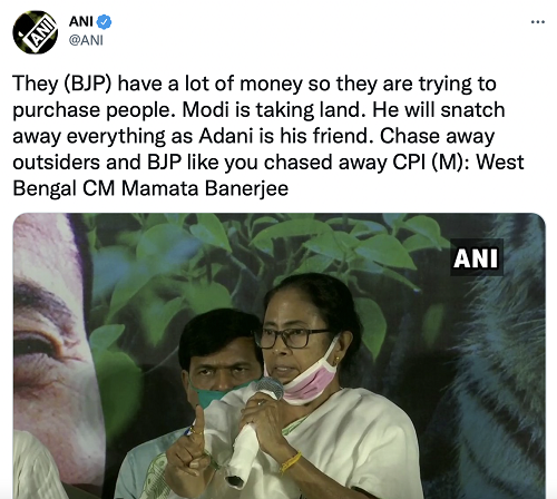 Further, on March 28, 2021, CM Mamata Banerjee again in an attempt to target PM Modi had alleged that all the decisions taken by the Centre were only for Ambani and Adani. “They (BJP) have a lot of money so they are trying to purchase people. Modi is taking land. He will snatch away everything as Adani is his friend”, she had stated.