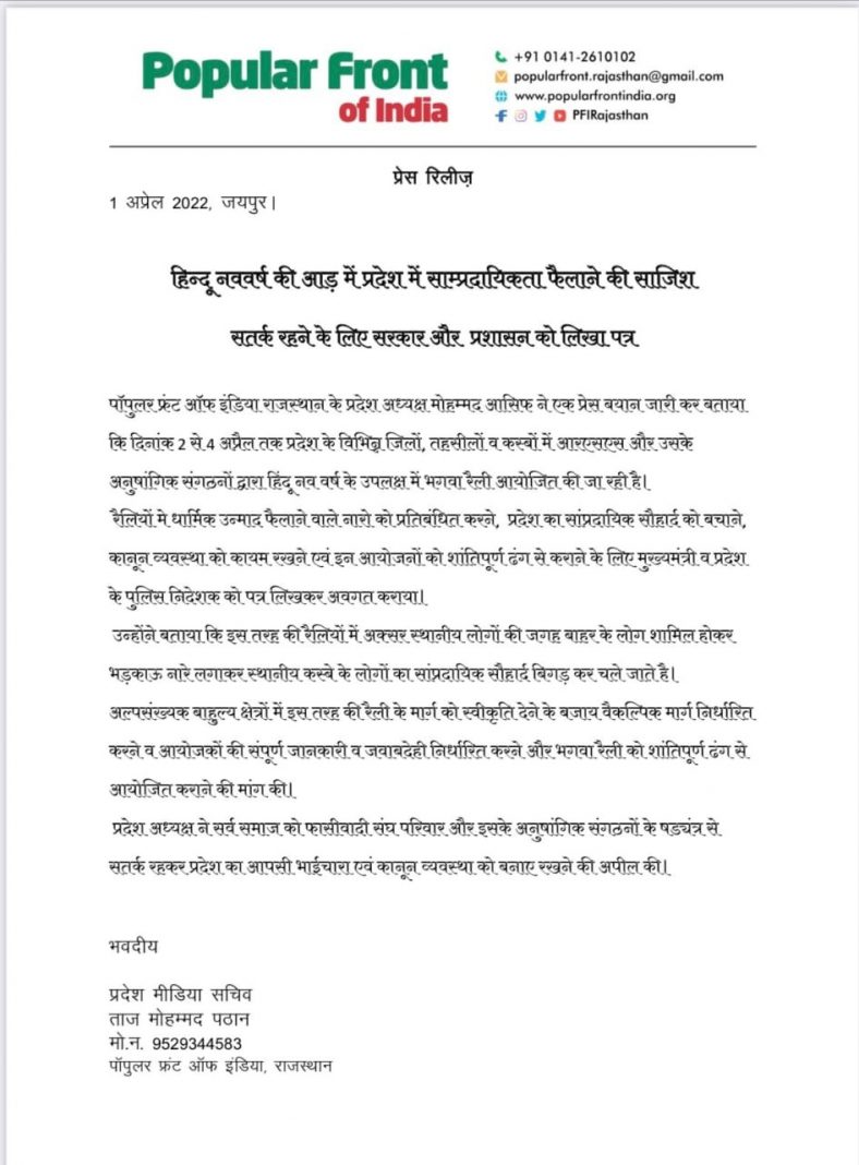 After Mohammad Asif wrote a letter to the chief minister and other government officials in the state, PFI released a press note on 1st April 2022 and shared information about the same. The press release stated, “From 2nd to 4th April, a saffron rally is being organized by RSS and its affiliated organizations in various districts, tehsils, and towns of the state to mark the Hindu New Year. Popular Front of India Rajasthan state president Mohammad Asif issued a press statement in this regard. He also wrote to the Chief Minister and the State Director of Police to ban the slogans that spread religious frenzy in the rallies, save the communal harmony of the state, maintain law and order and ensure peaceful conduct of these events.”