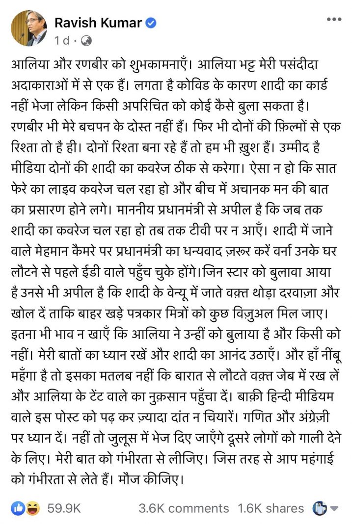 Ravish Kumar, in his Facebook post, appealed to Indian media to show the entire wedding without interruption, and not to take a break to start running Mann Ki Baat, PM Modi’s monthly radio program. He also requested PM Modi to avoid making any TV appearances during this time, so that he can enjoy the coverage of the wedding.