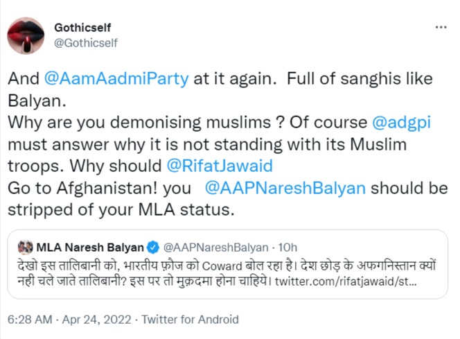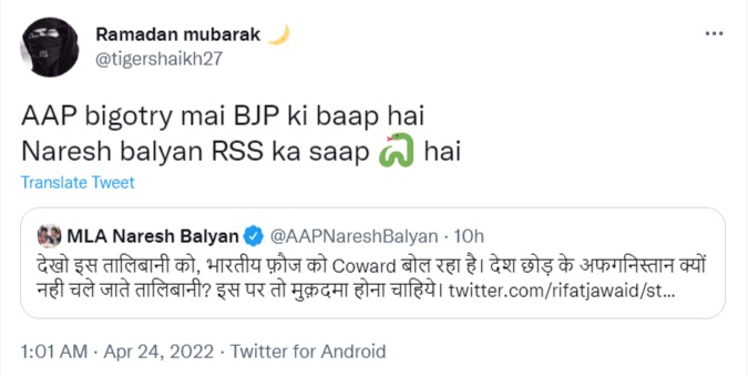 “AAP is the father of the BJP when it comes to showcasing bigotry. Naresh Balyan is the snake of RSS in the Aam Aadmi Party,” wrote another Islamist.