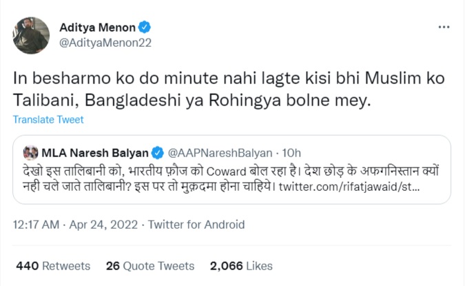 ‘Journalist’ Aditya Menon had tweeted, “These shameless people will not take 2 minutes to label Muslims as Talibani, Bangladeshi or Rohingya.”