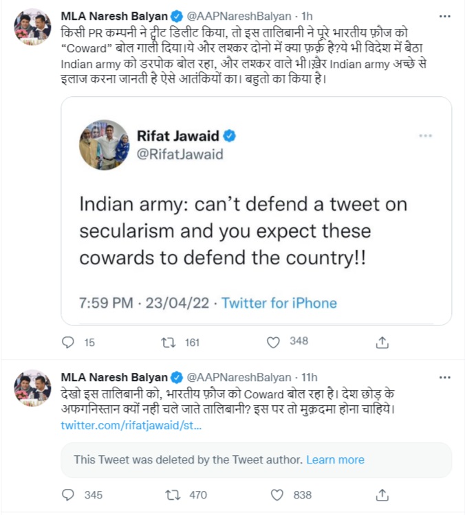 Islamists and terror apologists descended upon timeline of Aam Aadmi Party MLA Naresh Balyan after he called out Editor of pro-AAP blog Janta Ka Reporter Rifat Jawaid ‘Talibani’ for calling the Indian Army ‘coward’.