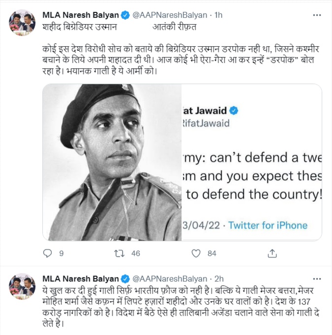 Naresh Balyan emphasised that the tweet of Rifat Jawaid was not just directed at the institution of the Indian army but those soldiers such as Major Mohit Sharma, who laid down their lives in the service of the nation. “This is an insult to 137 crore Indians,” he had tweeted.