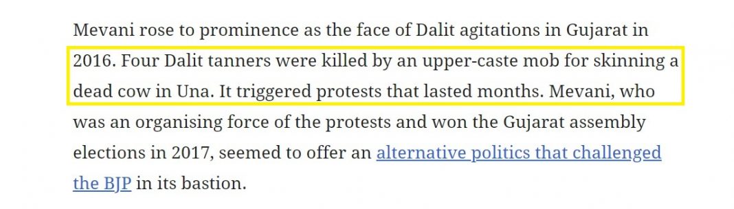 The author at this point wrote, “Mevani rose to prominence as the face of Dalit agitations in Gujarat in 2016. Four Dalit tanners were killed by an upper-caste mob for skinning a dead cow in Una. It triggered protests that lasted months. Mevani, who was an organising force of the protests and won the Gujarat assembly elections in 2017, seemed to offer an alternative politics that challenged the BJP in its bastion.”