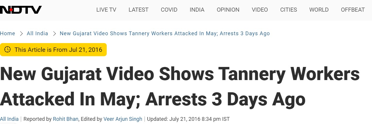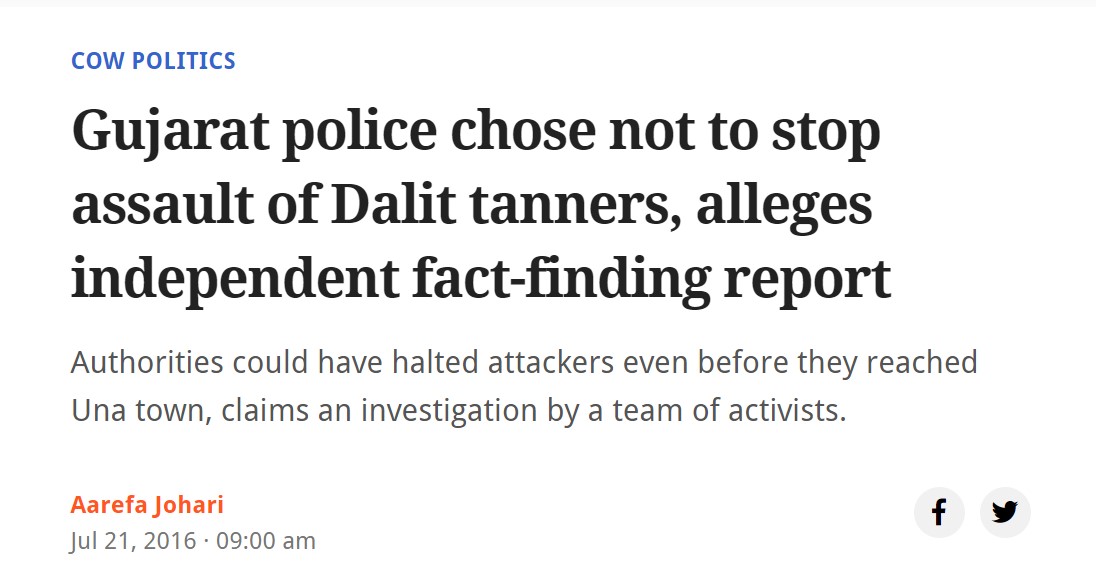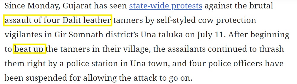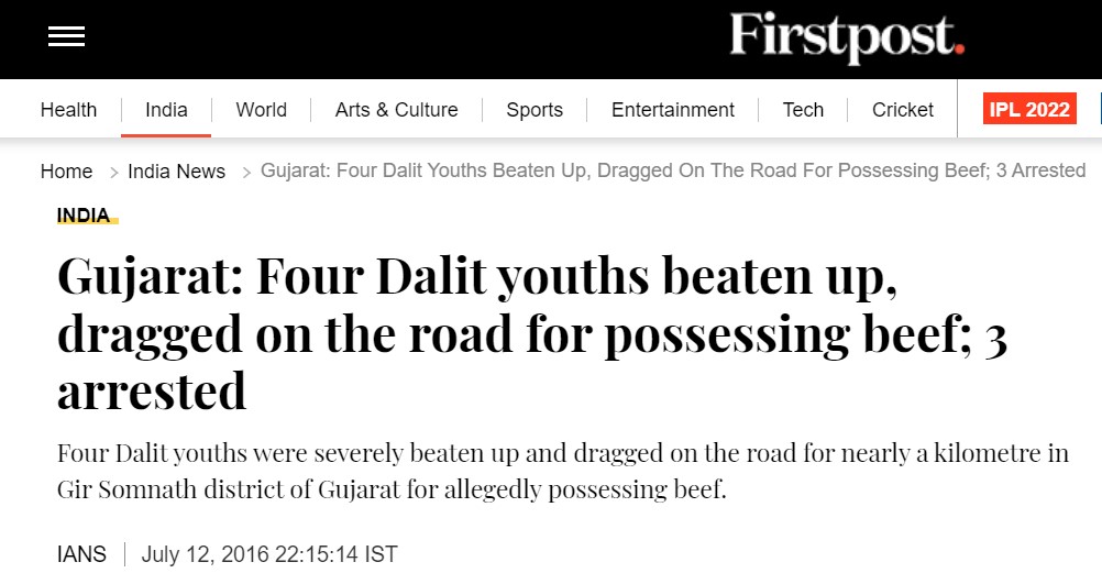 There are multiple reports on the public platform, in fact, many by other far-left news houses also, that distinctly mention that the cow smugglers were beaten up by the villagers for skinning a cow. None of the reports back then said that the Dalits were ‘killed’, that too by people belonging to the ‘upper-caste’.