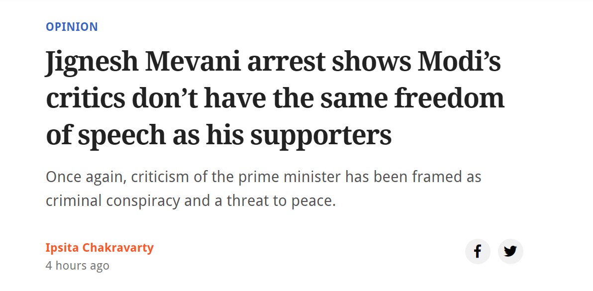 #Opinion: #JigneshMevani arrest shows Modi’s critics don’t have the same freedom of speech as his supporters