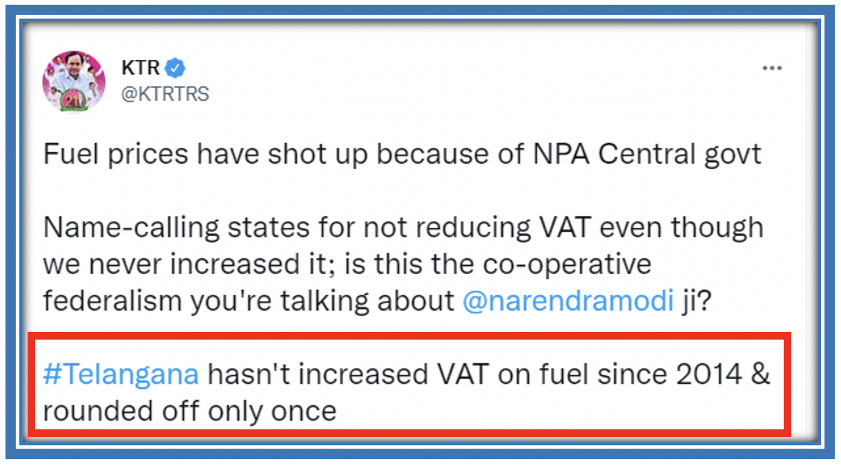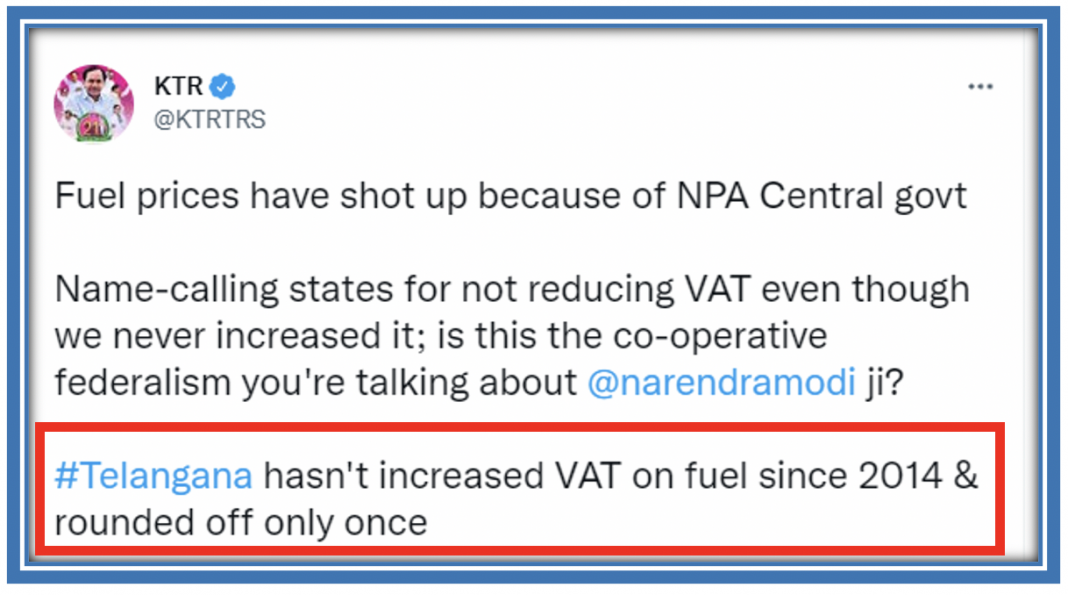 His son, the TRS party Working President, holder of multiple portfolios in the Telangana Cabinet, Mr KTR, then went on a rampage on Twitter. “Telangana hasn’t increased VAT on fuel since 2014 & rounded off only once”, he thundered.