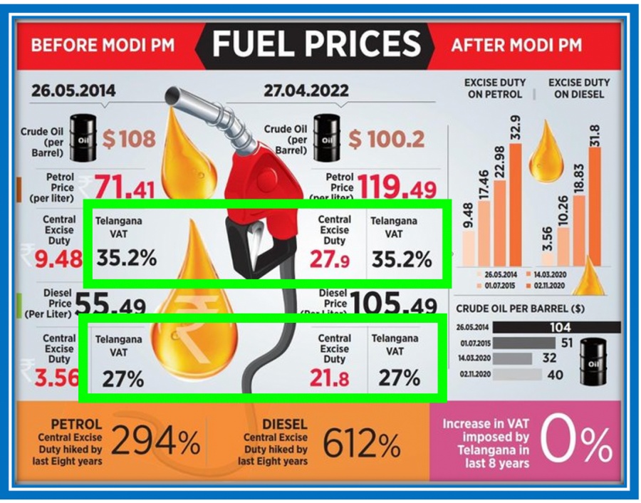 If tax by the central government is a loot, then what is a tax by the State government – a largesse? The state of Telangana has benefitted immensely from the ~4% increase in the tax because each time the price of the barrel goes up, the tax component also goes up! So, can we now call this sophisticated loot? Doesn’t the Telangana government also spend this money for the public good?