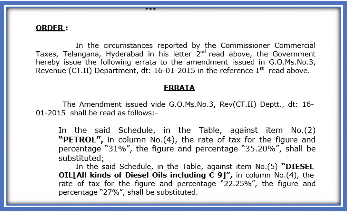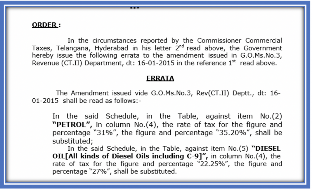 At that time, there was widespread outrage at this increase, so the order was modified to remove the 2 rupees increase but simply increased the actual tax component. On February 2, 2015, the Telangana government issued a GO increasing the tax on Petrol from the existing 31% to 35.20% and increasing the tax on Petrol from the existing 22.25% to 27%.