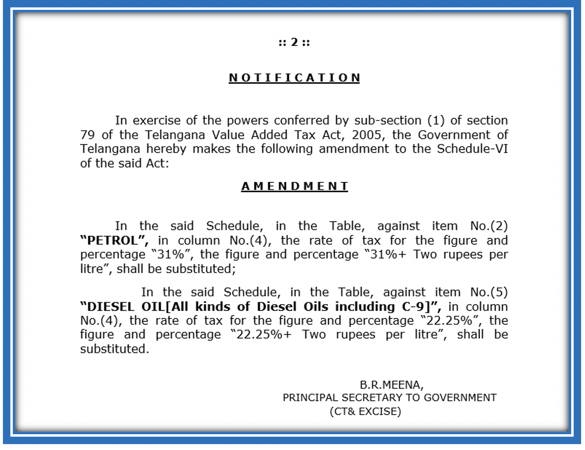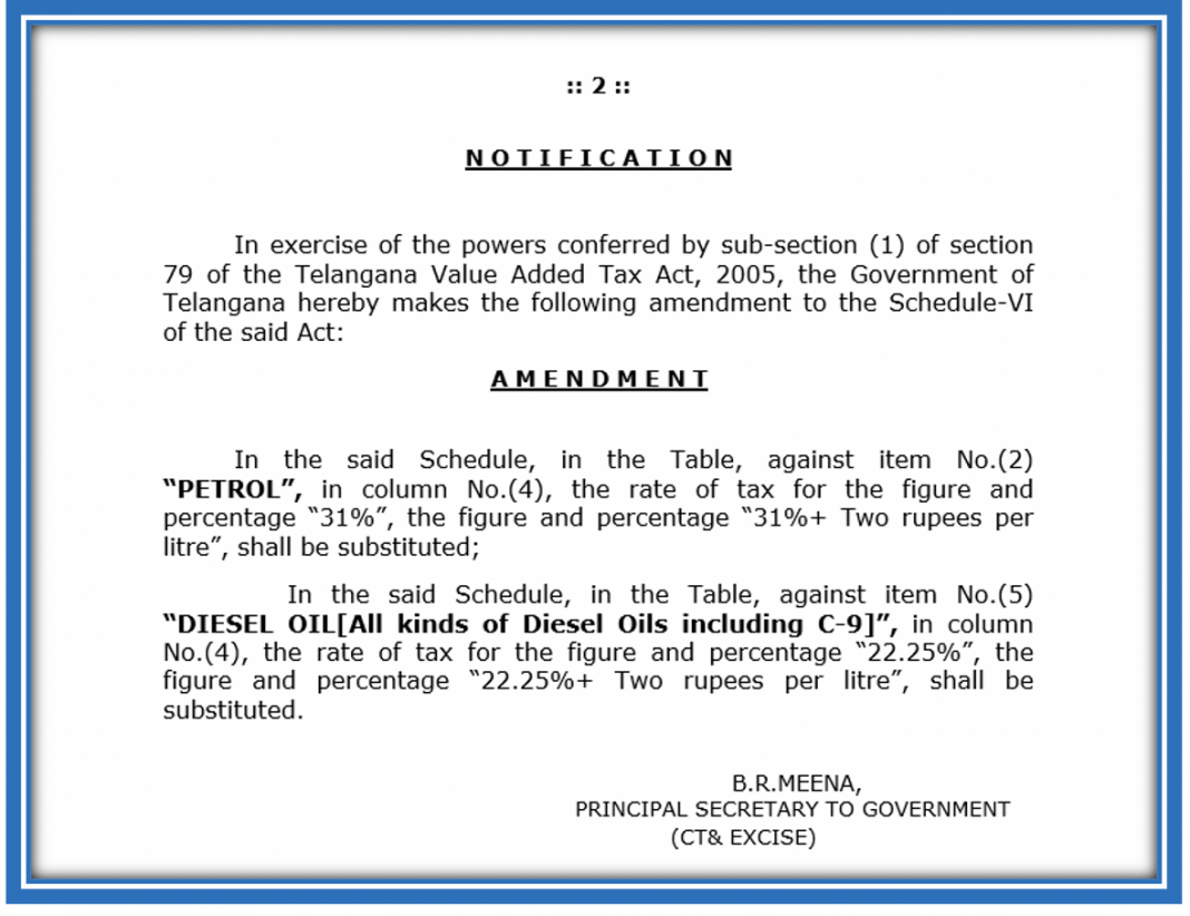 On January 17th 2015, the Telangana government issued a GO increasing the tax on Petrol from the existing 31% to “31% + 2 rupees per litre”; and the VAT on Diesel from 22.25% to “22.25% + 2 rupees per litre”.