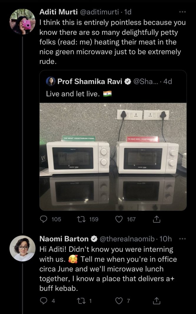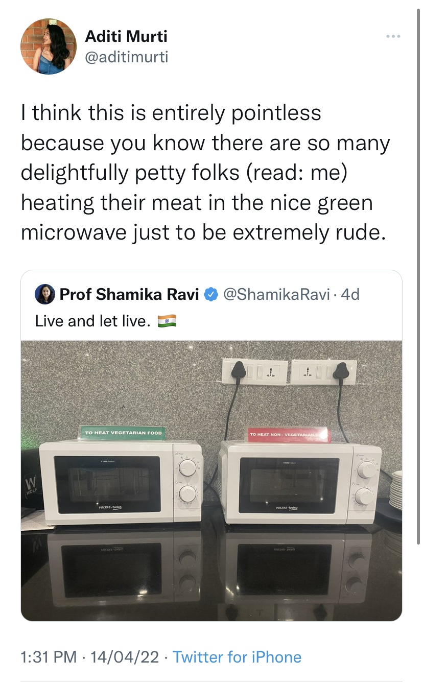 “I think this is entirely pointless because you know there are so many delightfully petty folks(read: me) heating their meat in the nice green microwave just to be extremely rude,” Aditi Murti, a reporting intern at The Wire Science tweeted while quoting Prof Shamika Ravi’s tweet.