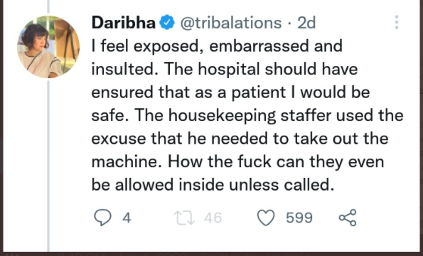 In a subsequent tweet, she wrote, “I feel exposed, embarrassed and insulted. The hospital should have ensured that as a patient I would be safe. The housekeeping staffer used the excuse that he needed to take out the machine. How the fu** can they even be allowed inside unless called.”