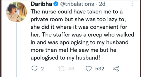 In another tweet in the thread, she further wrote, “The nurse could have taken me to a private room but she was too lazy to, she did it where it was convenient for her. The staffer was a creep who walked in and was apologising to my husband more than me! He saw me but he apologised to my husband!”