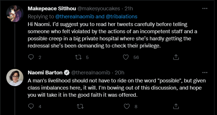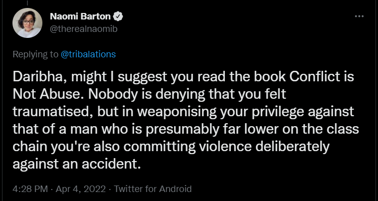 In the tweet, Naomi wrote, “Daribha, might I suggest you read the book Conflict is Not Abuse. Nobody is denying that you felt traumatised, but in weaponising your privilege against that of a man who is presumably far lower on the class chain you’re also committing violence deliberately against an accident.”