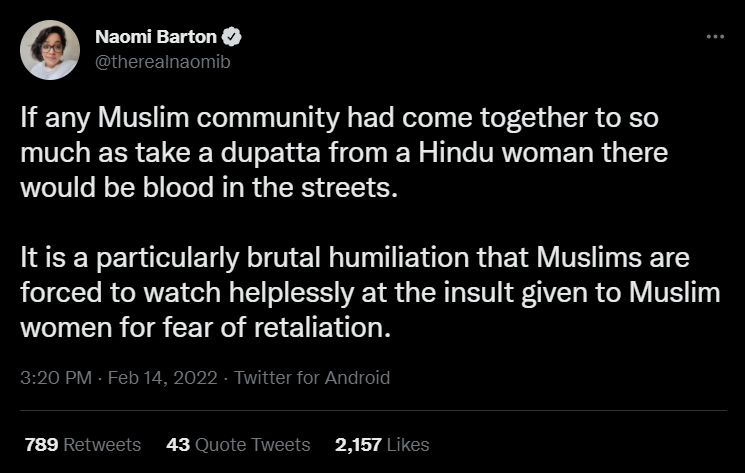 Barton had expressed that if a Muslim woman’s dupatta was taken away from her, the former would have swarmed to the streets, without thinking twice before sacrificing the blood of Muslims. Many people on social media saw this as an inflammatory Tweet intended to incite Muslims to respond with violence in response to the hijab controversy.