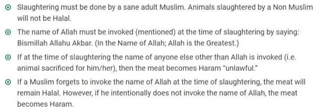 The Department of Halal Certification of the European Union makes it even more clear that employment opportunities at a Halal firm will be exclusively available to Muslims. It says, “Slaughtering must be done by a sane adult Muslim. Animals slaughtered by a Non-Muslim will not be Halal.” It states further, “The name of Allah must be invoked (mentioned) at the time of slaughtering by saying: Bismillah Allahu Akbar. (In the Name of Allah; Allah is the Greatest.) If at the time of slaughtering the name of anyone else other than Allah is invoked (i.e. animal sacrificed for him/her), then the meat becomes Haram “unlawful.”