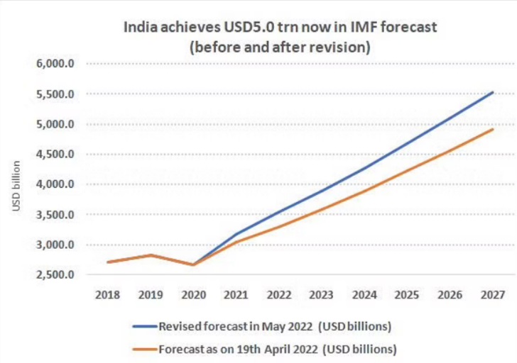 As per the latest revision by IMF, India will reach its $5 trillion economy target by 2026-2027 i.e. two years earlier than they initially predicted. The new forecast also claims that India will become a $5.5 trillion economy in 2027-2028.