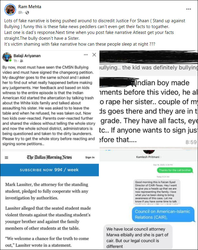 As per members of the Coppell ISD Concerned Parents and Taxpayers Facebook group, a false narrative against Shaan is being run to discredit him over the incident, and to justify the school’s decision to unfairly punish the victim of bullying. A Facebook user Ram Mehta shared several screenshots of the stories that were getting circulated against Shaan and his parents.