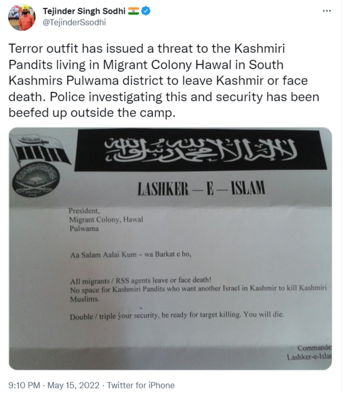 “All migrants and RSS agents leave or face death. No space for Kashmiri Pandits who want another Israel in Kashmir to kill Kashmiri Muslims. Double/triple your security, be ready for targeted killing. You will die,” the letter by terror outfit ‘Lashkar-e-Islam’ read.