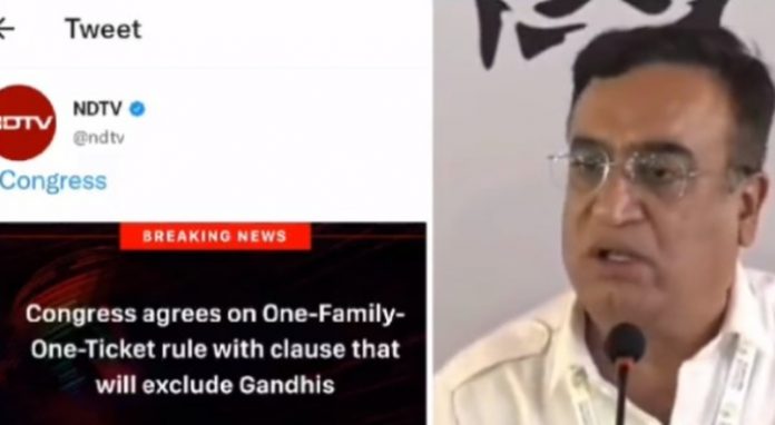 On May 13, Friday, controversial news outlet NDTV posted a Tweet saying that in an attempt to relaunch itself ahead of the crucial 2024 general elections, the Congress party has agreed on its much-touted “one family, one ticket” norm but with a clause that exempts the Gandhis.