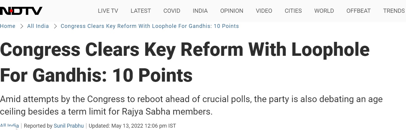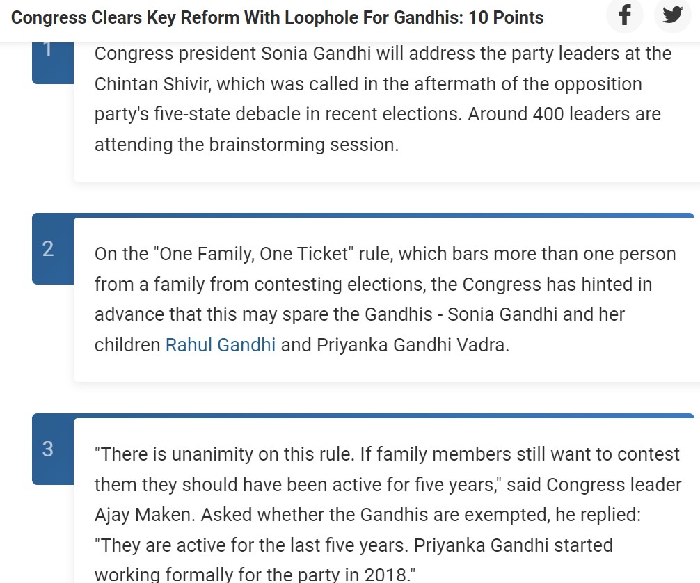NDTV, in its news report published on May 13 titled, “Congress Clears Key Reform With Loophole For Gandhis: 10 Points”, mentions that at the three-day “Chintan Shivir” or introspection in Rajasthan’s Udaipur beginning Friday, the Congress agreed that a “‘One Family, One Ticket’ rule will return with a rider that exempts the Gandhis.”