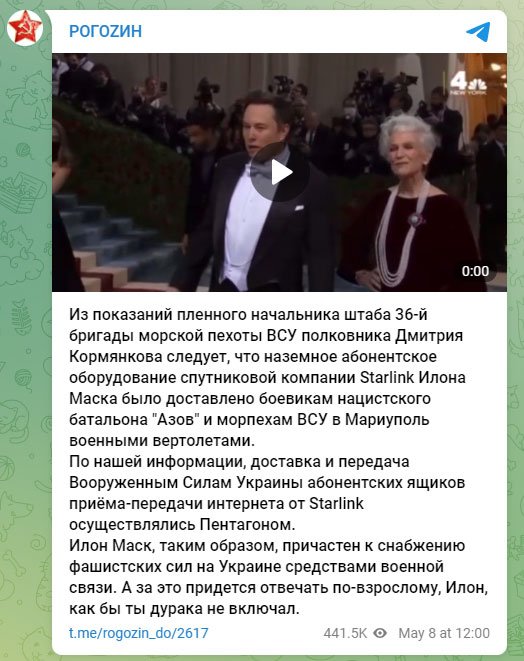 Musk shared a screenshot of a Telegram post by Rogozin in Russian that translated to, “From the testimony of the captured chief of staff of the 36th Marine Brigade of the Armed Forces of Ukraine, Colonel Dmitry Kormyankov, it follows that the ground-based subscriber equipment of the Starlink satellite company Elon Musk was delivered to the militants of the Nazi Azov Battalion and the Marines of the Armed Forces of Ukraine to Mariupol by military helicopters.”
