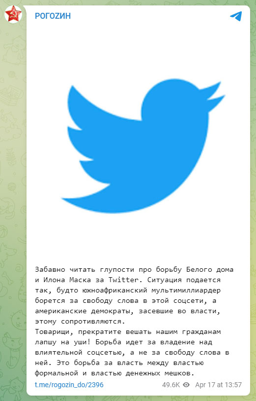 Rogozin, on his Telegram channel, has targeted Elon Musk multiple times. When the social media platform Twitter had yet to announce the takeover by Elon Musk, he said it was funny to read about the “fight” between the White House and Elon Musk. He said, “The situation is presented as if the South African multibillionaire is fighting for freedom of speech on this social network, and the American Democrats, who have settled in power, are resisting this.”
