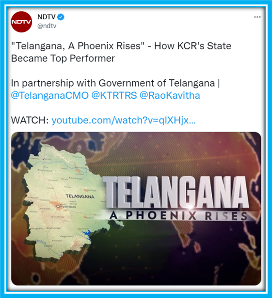 While the entire excitement of NDTV made a lot of sense now, it was really baffling as to why a sitting Chief Minister of a state would go to Delhi and meet the owner of a news channel whose viewership has been on perpetual decline? Just about a month ago, NDTV ran a 30-minute program on “Telangana – A phoenix rises” without telling the viewer that the Telangana government paid for the program. The choice of the phrase – “In partnership” – is also intriguing. NDTV isn’t telling you that they are paid for it, but they actually partnered and worked with the Telangana government to prepare this program!