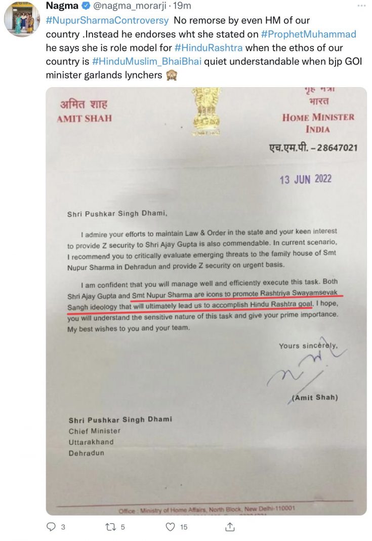 While tweeting a copy of the letter, Nagma Moraraji wrote, “No remorse by even the Home Minister of our country. Instead, he endorses what she stated on Prophet Muhammad. He says she is a role model for Hindu Rashtra when the ethos of our country is Hindu-Muslim Bhai Bhai. Quite understandable when BJP Minister garlands lynchers.”