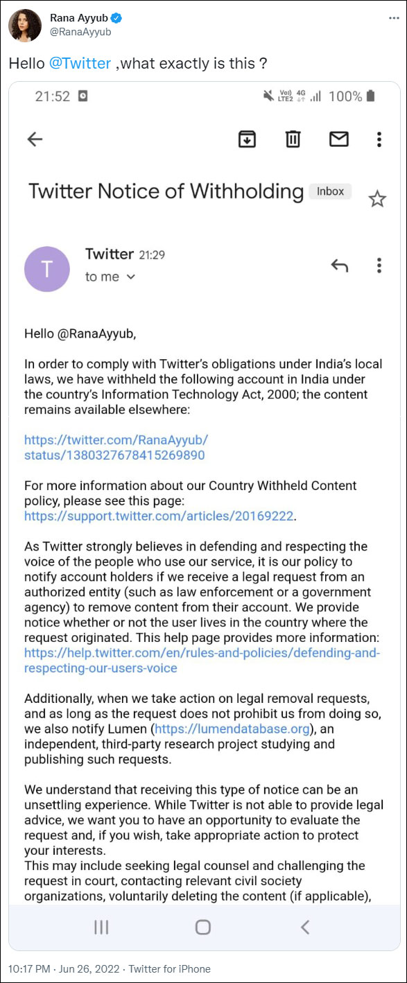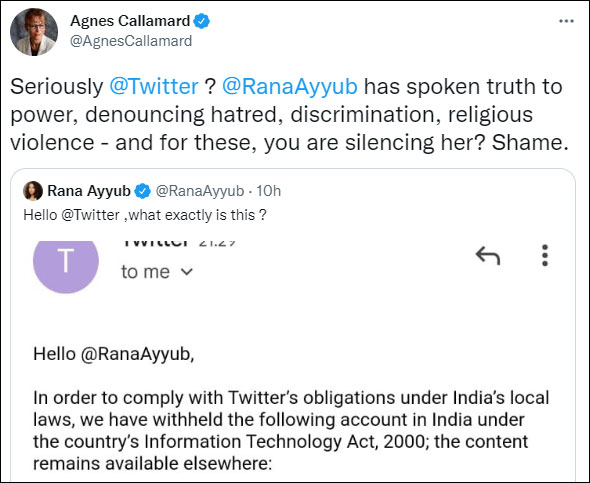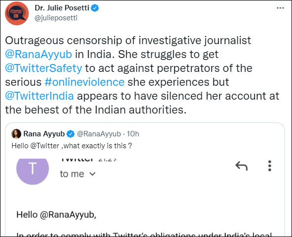 Dr Julie Posetti, Global Director of Research at the International Centre For Journalists, said, “Outrageous censorship of investigative journalist Rana Ayyub in India. She struggles to get @TwitterSafety to act against perpetrators of the serious #onlineviolence she experiences, but @TwitterIndia appears to have silenced her account at the behest of the Indian authorities.”