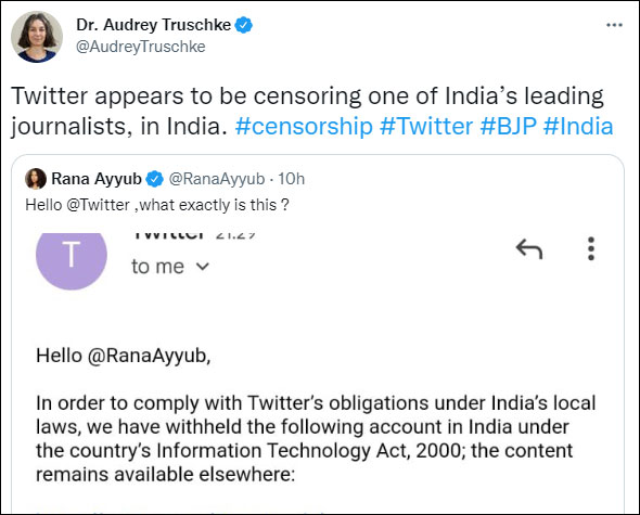 As expected, the ecosystem that backs Ayyub’s propaganda-filled tweets and reports rushed to support her. Pro-Aurangzeb “professor” Audrey Truschke, who is on the mission to defame India, wrote, “Twitter appears to be censoring one of India’s leading journalists, in India.”